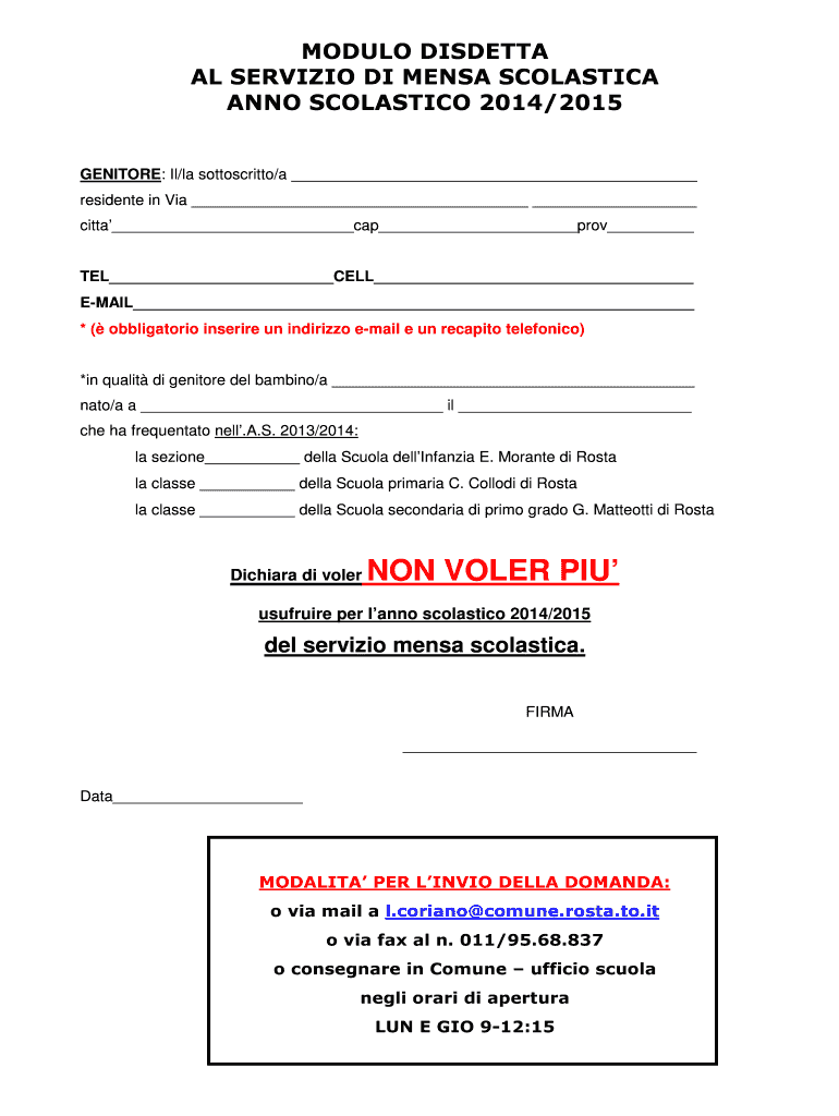 MODULO DISKETTE AL SERVILLO DI MENSA SCHOLASTIC ANNA SCHOLASTIC 2014×2015 GENITIVE: IL×la sottoscritto×a resident in Via pitta cap prov TEL CELL EMAIL * (obligatory inspire un indirizzo email e