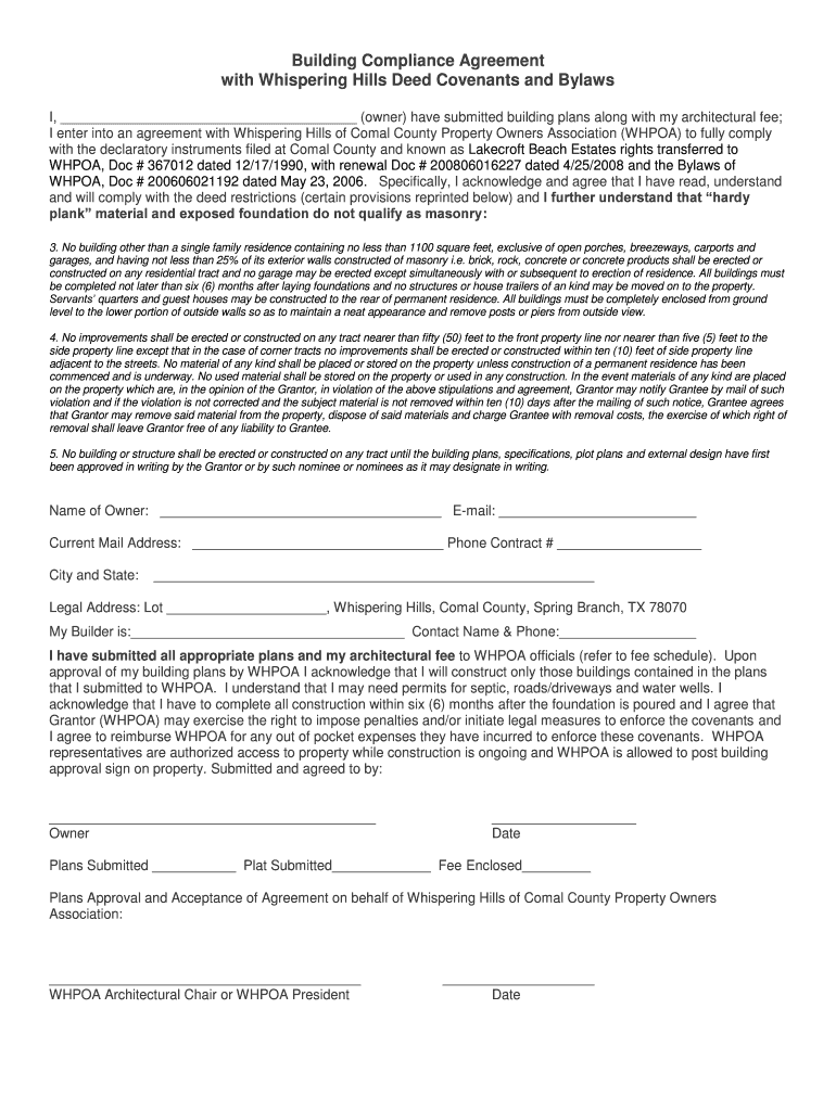 Building Compliance Agreement with Whispering Hills Deed Covenants and Bylaws I, (owner) have submitted building plans along with my architectural fee; I enter into an agreement with Whispering Hills