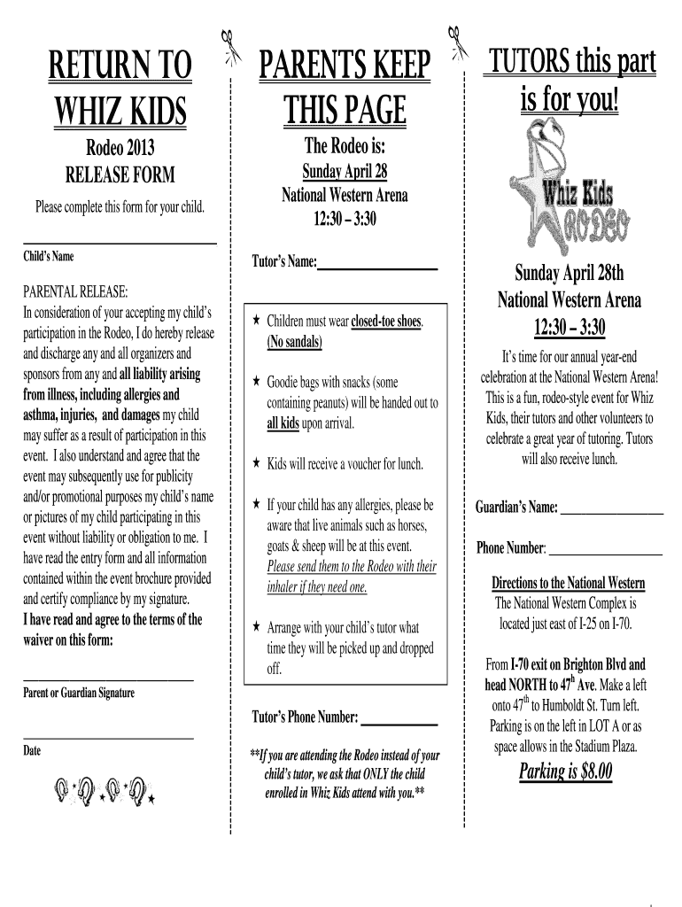 Please complete this form for your child. Child's Name PARENTAL RELEASE: In consideration of your accepting my children participation in the Rodeo, I do hereby release and discharge any and all organizers
