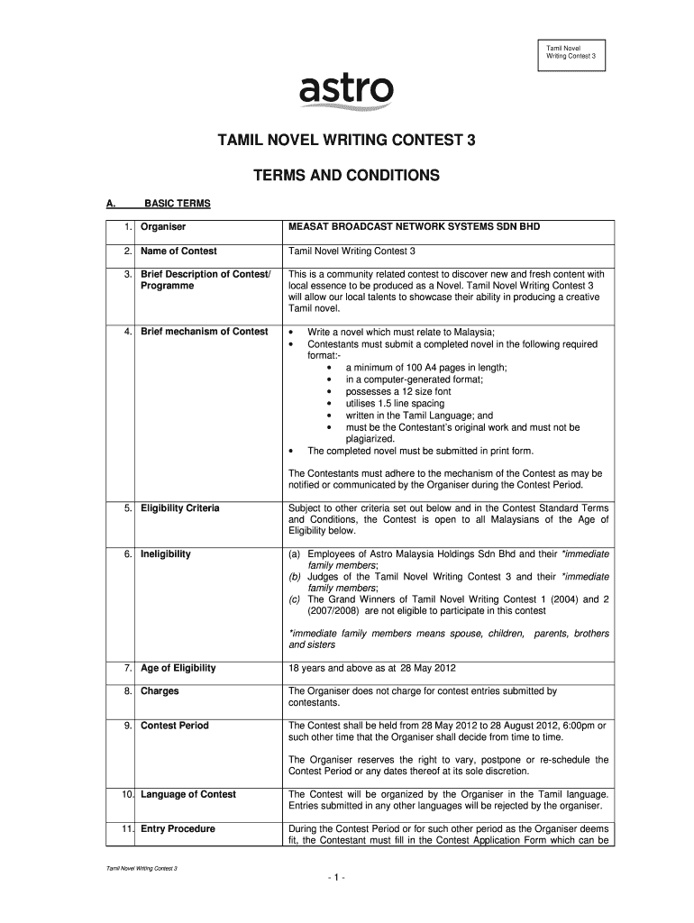 1. OrganiserMEASAT BROADCAST NETWORK SYSTEMS SDN BHD2. Name of Contest Tamil Novel Writing Contest 33.