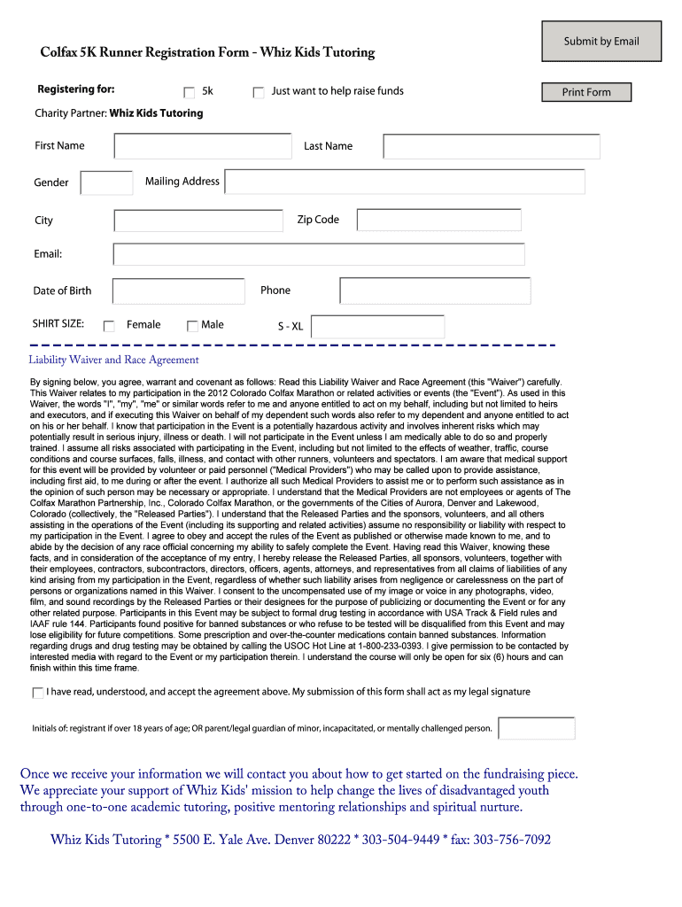 Colfax 5K Runner Registration Form Whiz Kids Tutoring Registering for: 5k Just want to help raise funds Submit by Email Print Form Charity Partner: Whiz Kids Tutoring First Name Gender Last Name Mailing