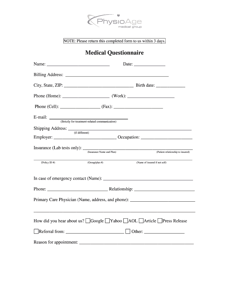 NOTE: Please return this completed form to us within 3 days. Medical Questionnaire Name: Date: Billing Address: City, State, ZIP: Birth date: Phone (Home): (Work): Phone (Cell): (Fax): E-mail: (Strictly
