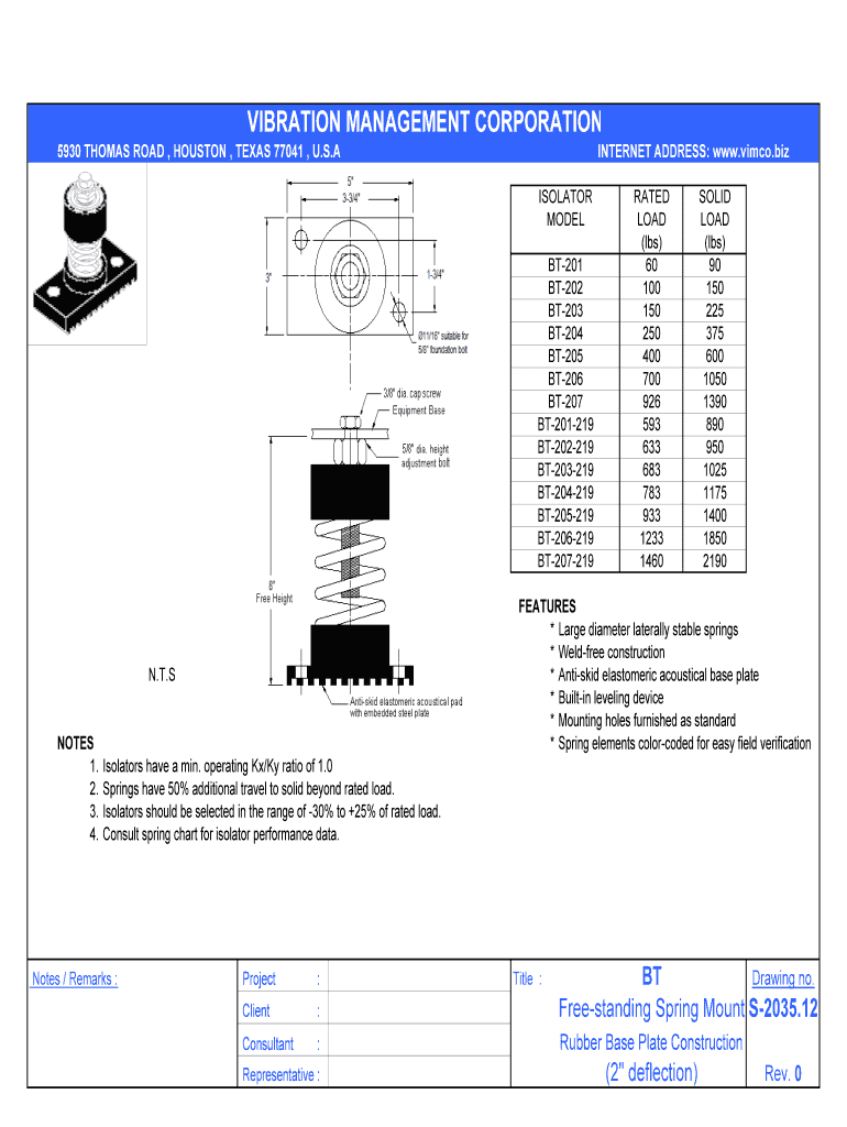 VIBRATION MANAGEMENT CORPORATION 5930 THOMAS ROAD, HOUSTON, TEXAS 77041, U.S.A. INTERNET ADDRESS: www.vimco.biz ISOLATOR MODEL BT201 BT202 BT203 BT204 BT205 BT206 BT207 BT201219 BT202219 BT203219