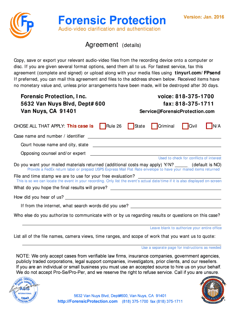 Forensic Protection Version: Jan. 2016 Audio video clarification and authentication Agreement (fees) SERVICES FREE Evaluation Complete evaluation of audio×video×image work feasibility and expectations