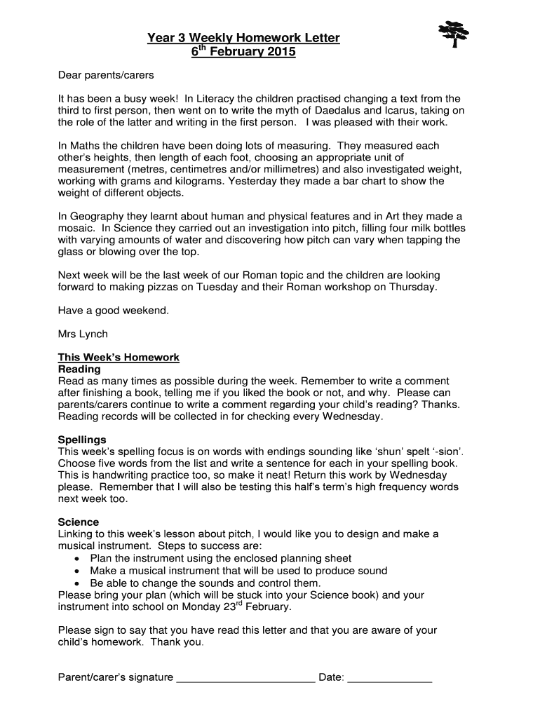 Get the free Year 3 Weekly Homework Letter - stjohns-redhill surrey sch