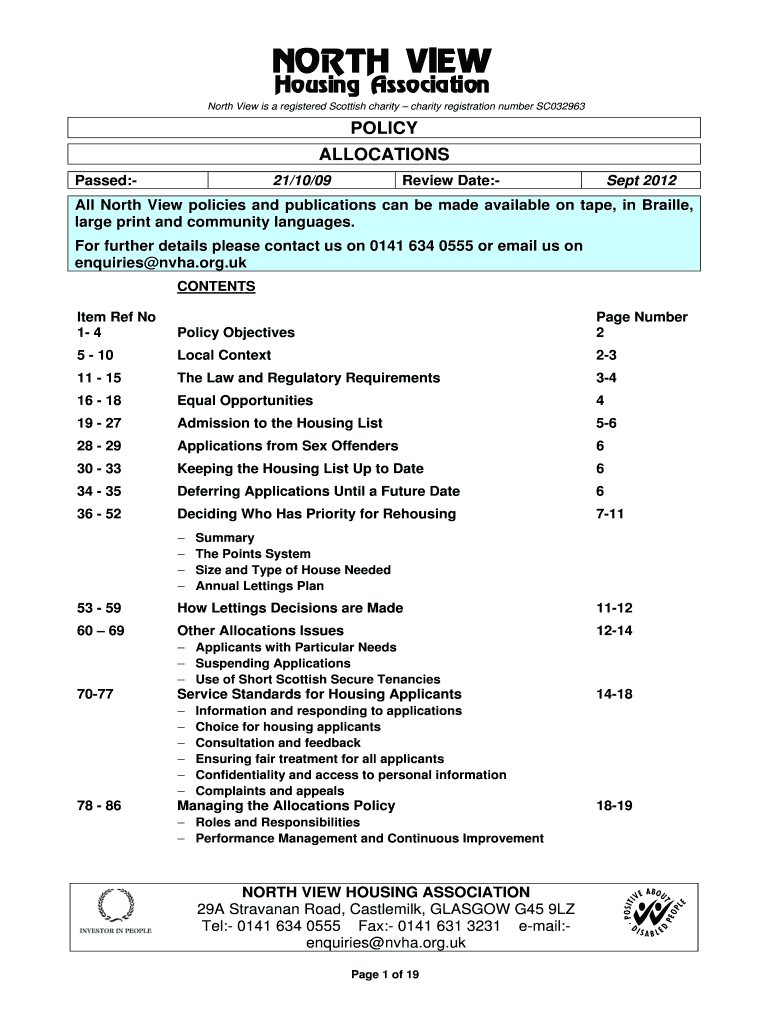 NORTH VIEW Housing Association North View is a registered Scottish charity registration number SC032963 POLICY ALLOCATIONS Passed: 21×10/09 Review Date: Sept 2012 All North View policies and publications