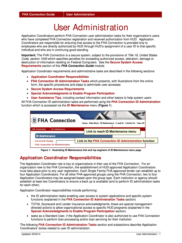 FHA Connection Guide User Administration Application Coordinators perform FHA Connection user administration tasks for their organization's users who have completed FHA Connection registration and
