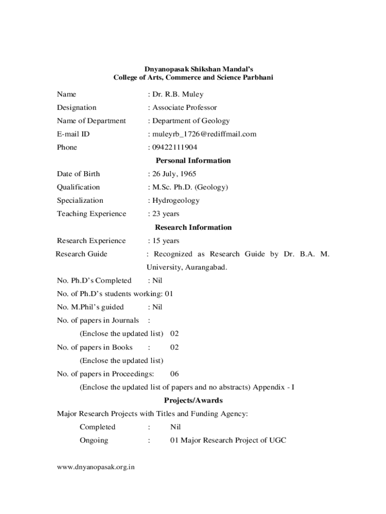 College of Arts, Commerce and Science ParbhaniName: Dr. R.B. MuleyDesignation: Associate Professorial of Department: Department of GeologyEmail ID: muleyrb_1726@rediffmail.comPhone: