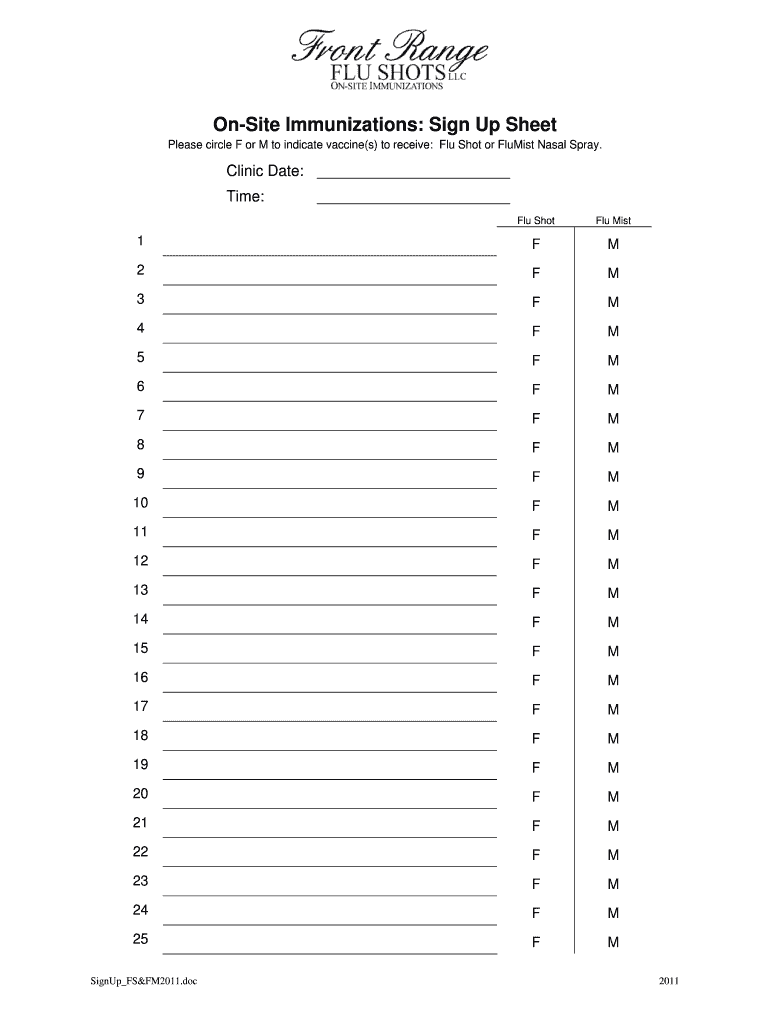 Get the free On-Site Immunizations: Sign Up Sheet - Front Range Flu Shots, LLC