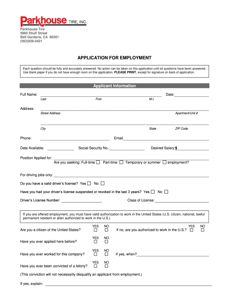 Park house Tire 5960 Shall Street Bell Gardens, CA 90201 ×562×9280421 APPLICATION FOR EMPLOYMENT Each question should be fully and accurately answered. No action can be taken on this application
