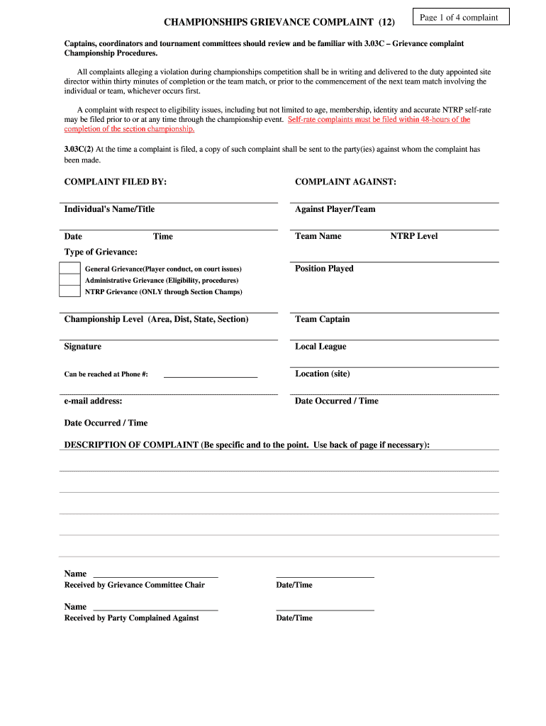 CHAMPIONSHIPS GRIEVANCE COMPLAINT (12) Page 1 of 4 complaint Captains, coordinators and tournament committees should review and be familiar with 3.03C Grievance complaint Championship Procedures.