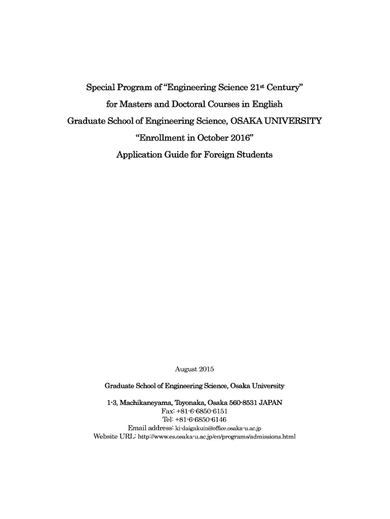Special Program of Engineering Science 21st Century for Masters and Doctoral Courses in English Graduate School of Engineering Science, OSAKA UNIVERSITY Enrollment in October 2016 Application Guide
