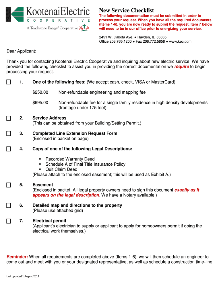 New Service Checklist The following documentation must be submitted in order to process your request. When you have all the required documents (Items 16×, you are now ready to submit the request.