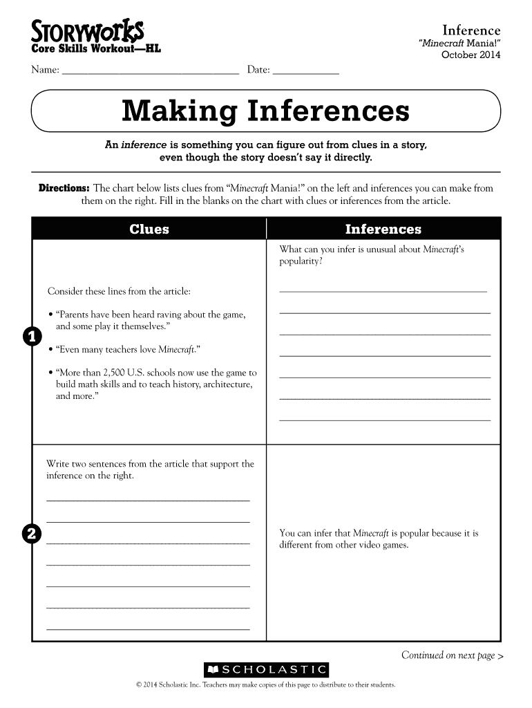Inference Minecraft Mania! October 2014 Core Skills Workout HL Name: Date: Making Inferences An inference is something you can figure out from clues in a story, even though the story doesn't say it