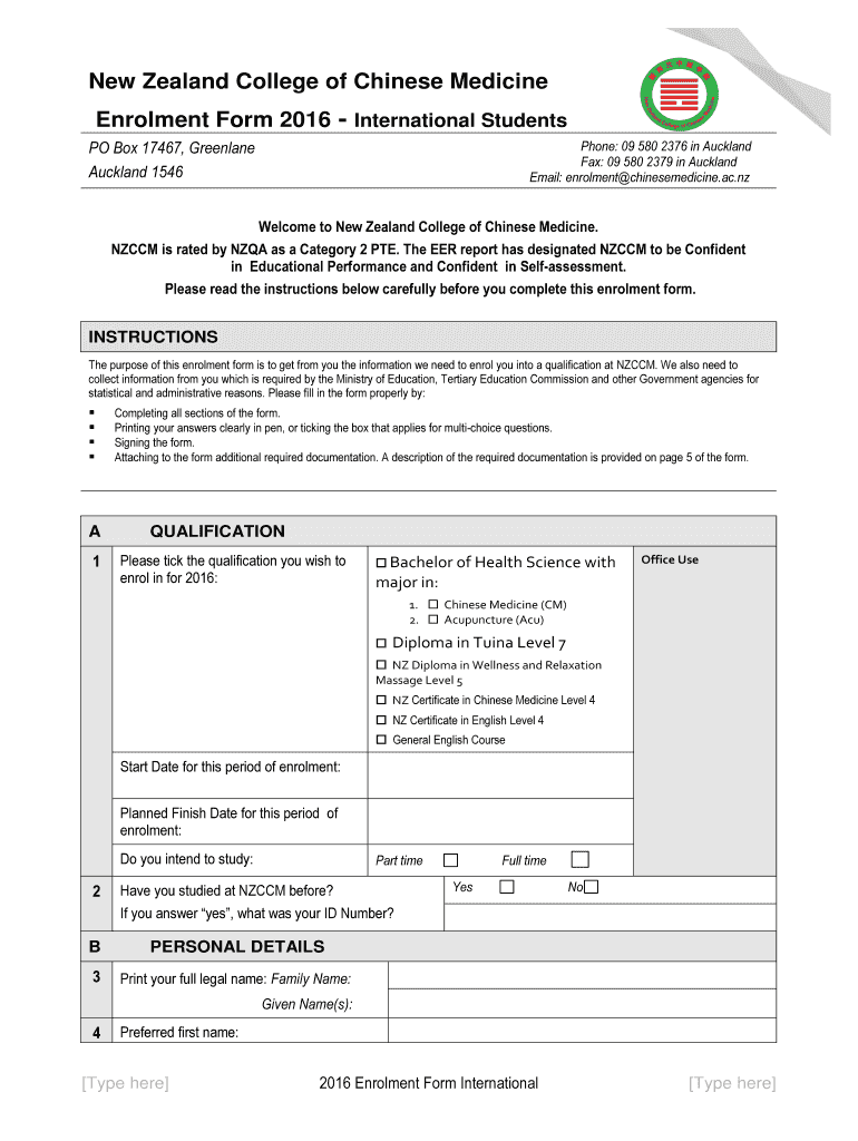 Get the free New Zealand College of Chinese Medicine Enrolment Form - chinesemedicine ac