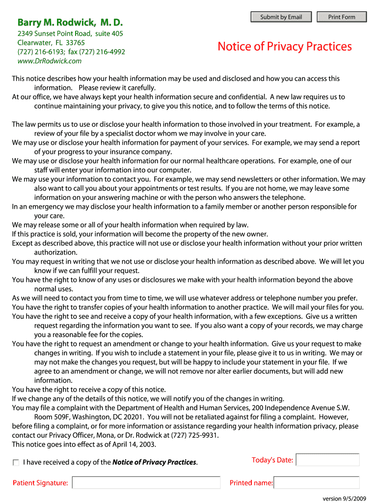 Barry M. Rodrick, M. D. 2349 Sunset Point Road, suite 405 Clearwater, FL 33765 ×727× 2166193; fax (727× 2164992 www.DrRodwick.com Submit by Email Print Form Notice of Privacy Practices This notice