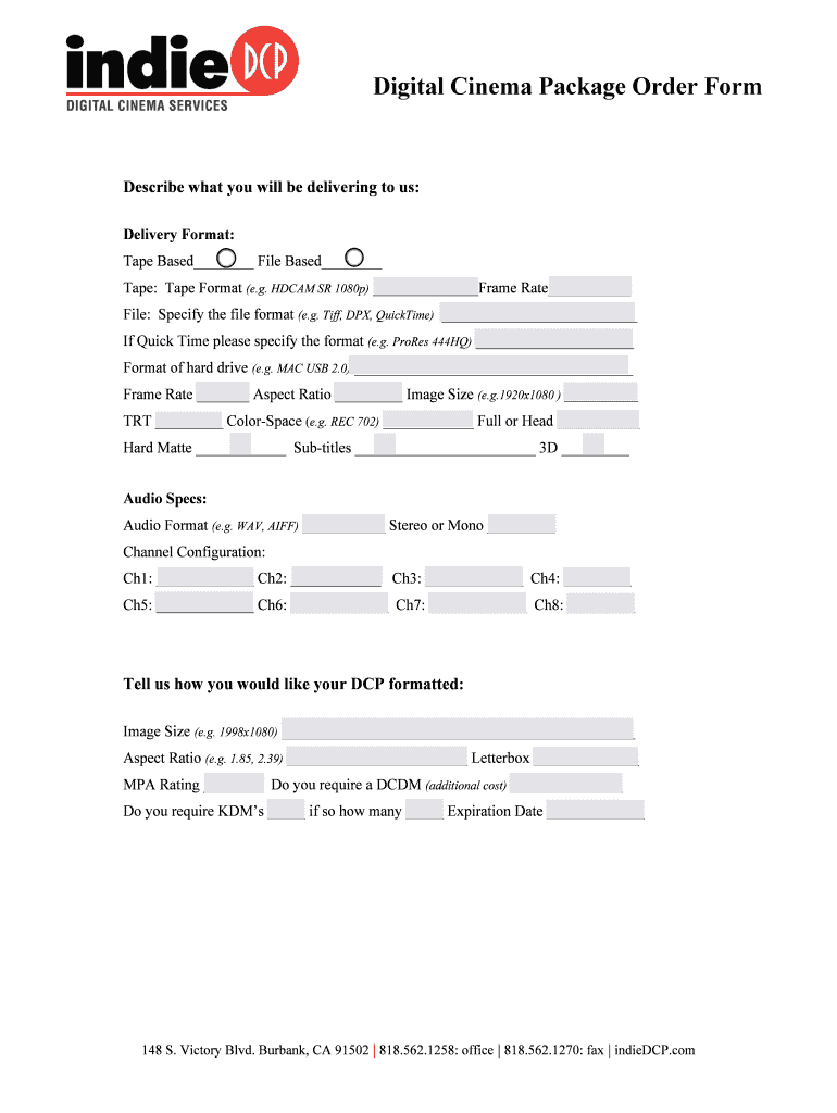Digital Cinema Package Order Form Describe what you will be delivering to us: Delivery Format: Tape Based File Based Tape: Tape Format (e.g. ADCAM SR 1080p) Frame Rate File: Specify the file format