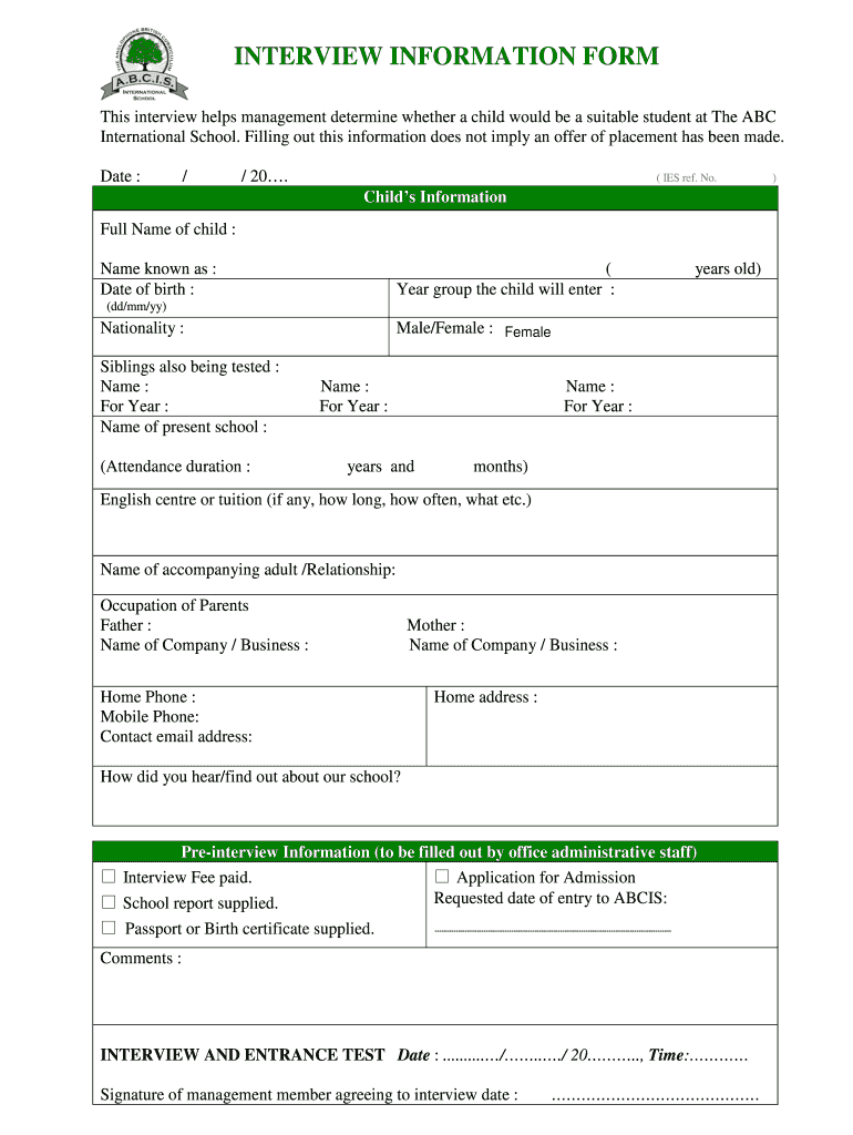 INTERVIEW INFORMATION From This interview helps management determine whether a child would be a suitable student at The ABC International School. Filling out this information does not imply an offer