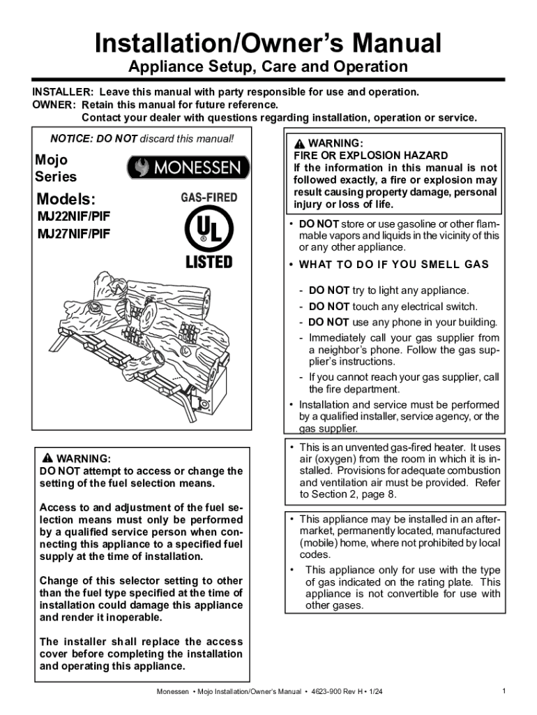 Installation/Owners Manual Appliance Setup, Care and OperationINSTALLER: Leave this manual with party responsible for use and operation. OWNER: Retain this manual for future reference. Contact your