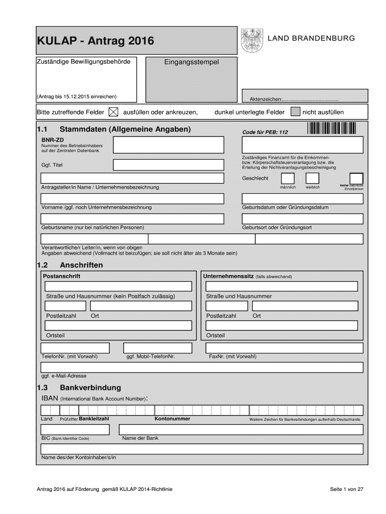 KUL AP Ant rag 2016 Zustndige Bewilligungsbehrde Eingangsstempel (Ant rag bis 15.12.2015 attached) Bitter zutreffende Elder 1.1 Aktenzeichen:....................................... Allen Oder ankreuzen,