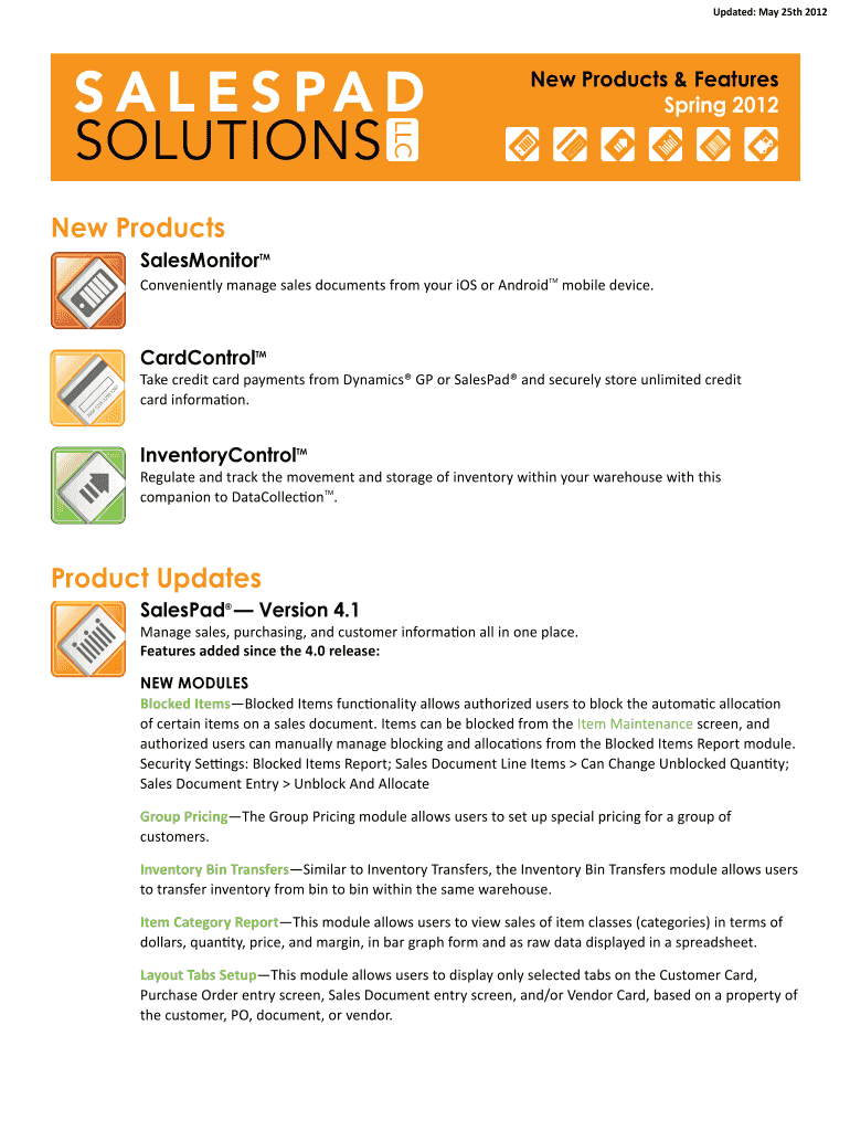 Updated: May 25th 2012 New Products & Features Spring 2012 New Products SalesMonitorTM Conveniently manage sales documents from your iOS or Android TM mobile device. CardControlTM Take credit card