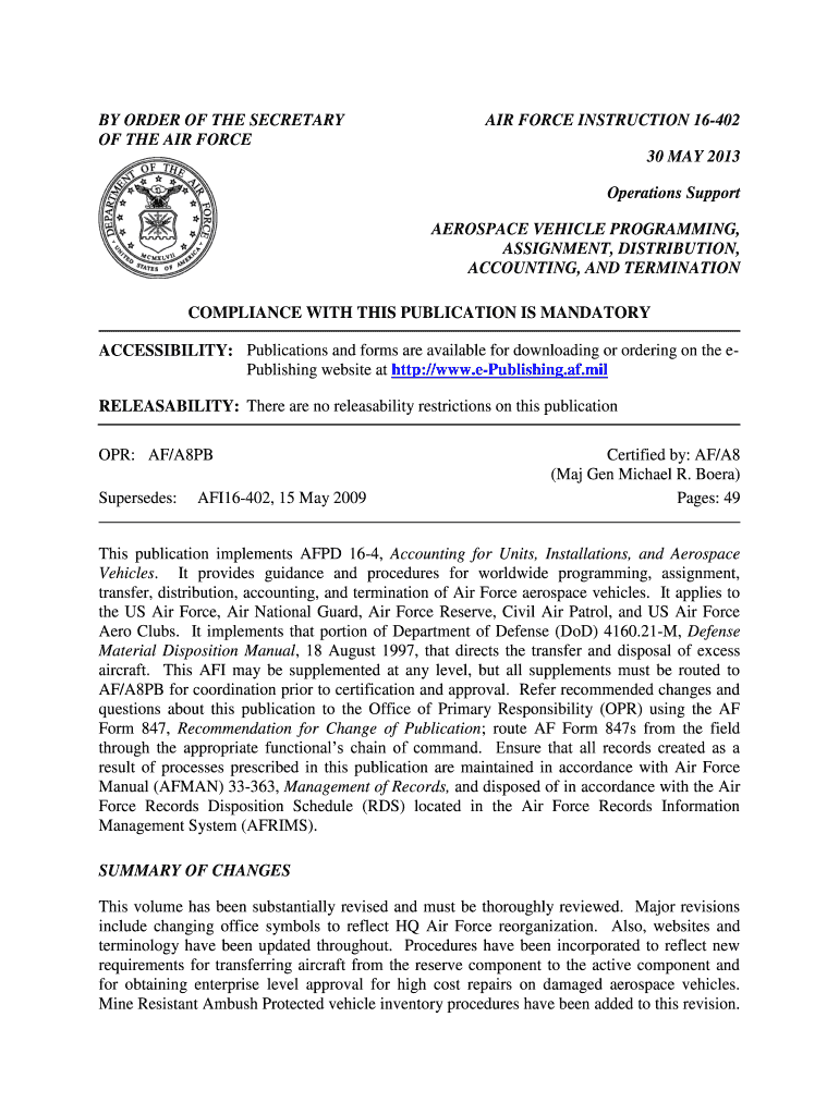 BY ORDER OF THE SECRETARY OF THE AIR FORCE INSTRUCTION 16402 30 MAY 2013 Operations Support AEROSPACE VEHICLE PROGRAMMING, ASSIGNMENT, DISTRIBUTION, ACCOUNTING, AND TERMINATION COMPLIANCE WITH THIS
