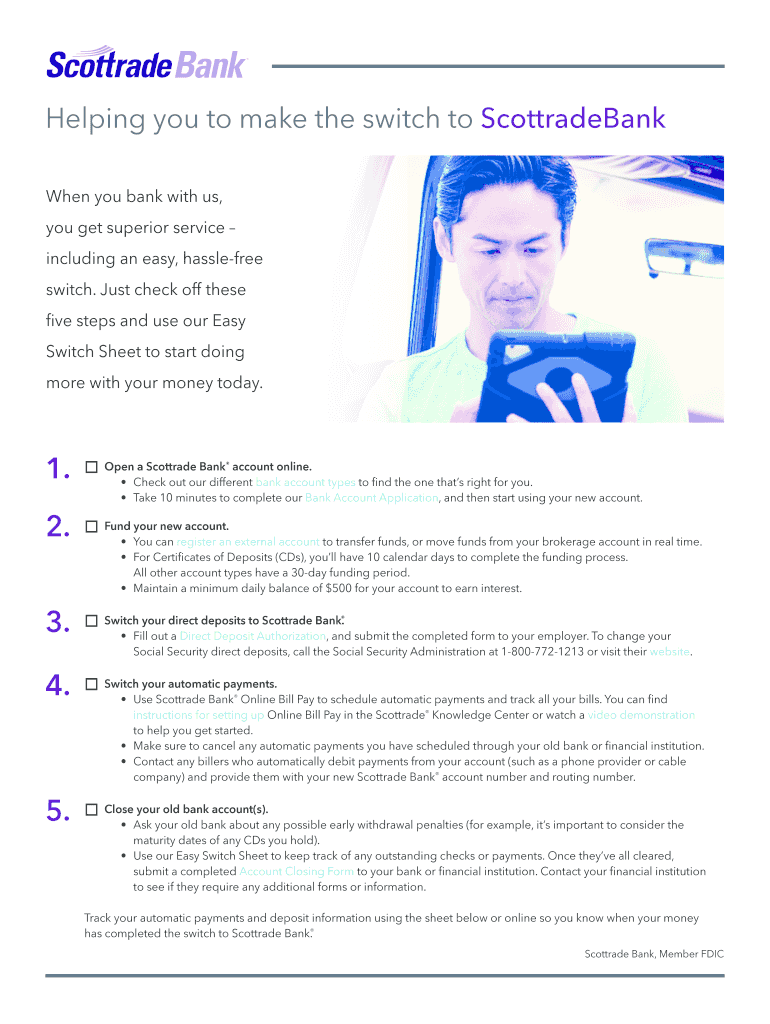 Any customer looking to switch their banking services to Scottrade Bank can use the Scottrade Bank Switch Kit, provided they are opening a new account at Scottrade.