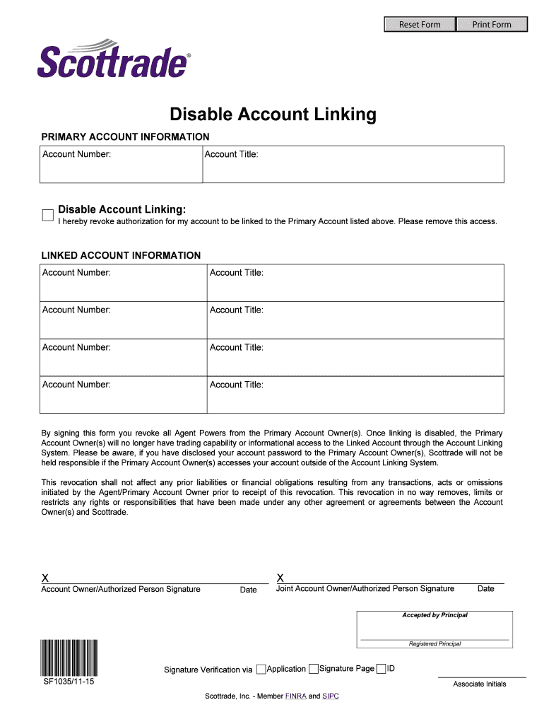 The Scottrade Account Linking Disabling Form is a document used by account owners to revoke authorization for their accounts to be linked to a primary account.