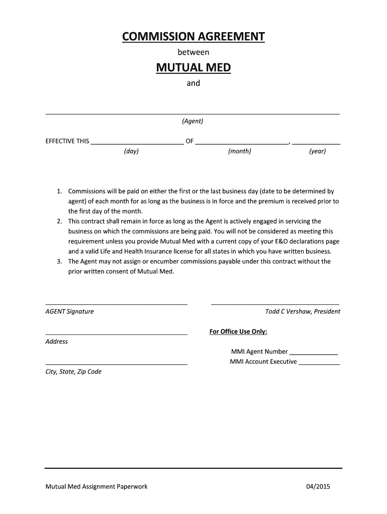 Both the agent and the president of Mutual Med need to sign the Commission Agreement to validate the terms regarding commission payments.