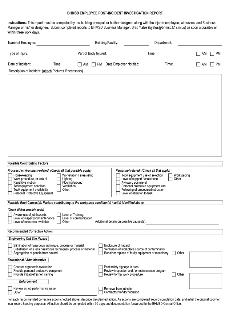 Get the free BHMSD EMPLOYEE POST-INCIDENT INVESTIGATION REPORT Instructions - bhmsd