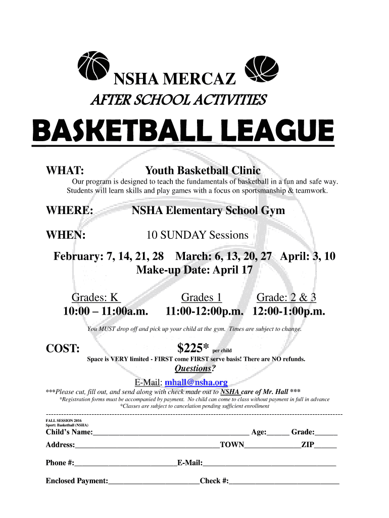 NSA MERCY AFTER SCHOOL ACTIVITIES BASKETBALL LEAGUE WHAT: Youth Basketball Clinic Our program is designed to teach the fundamentals of basketball in a fun and safe way. Students will learn skills