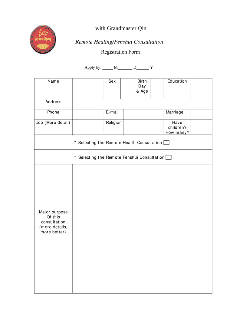 With Grand master Qin Remote Healing×Census Consultation Registration Form Applies by: M D Y Name Sex Birth Day & Age Education Address Phone Job (More detail) Email Marriage Religion Have children?