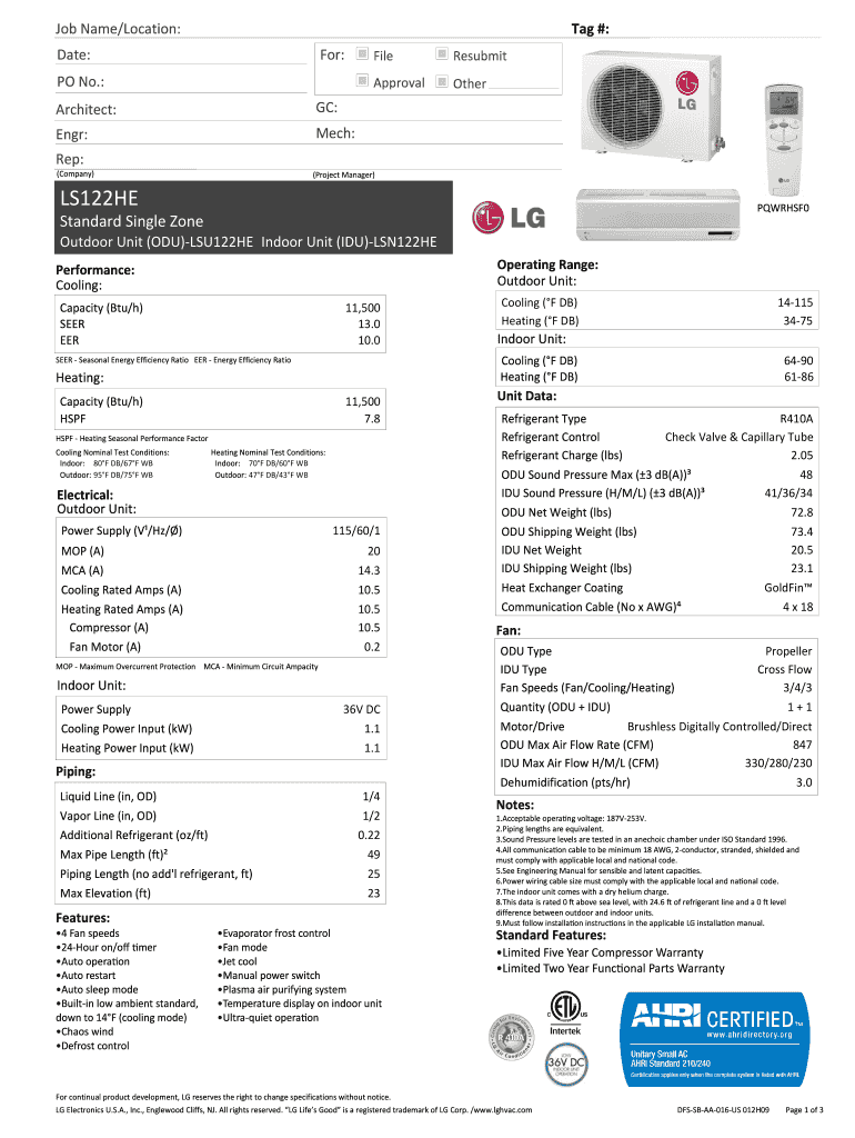 Tag#: Name×Location: Date: For: File Approval Pond.: Architect: Other GC: ENG: Resubmit Much: Rep: (Company) (ProjectManager) LS122HE PQWRHSF0 StandardSingleZone OutdoorUnit×ODD×LSU122HE IndoorUnit×ID×LSN122HE