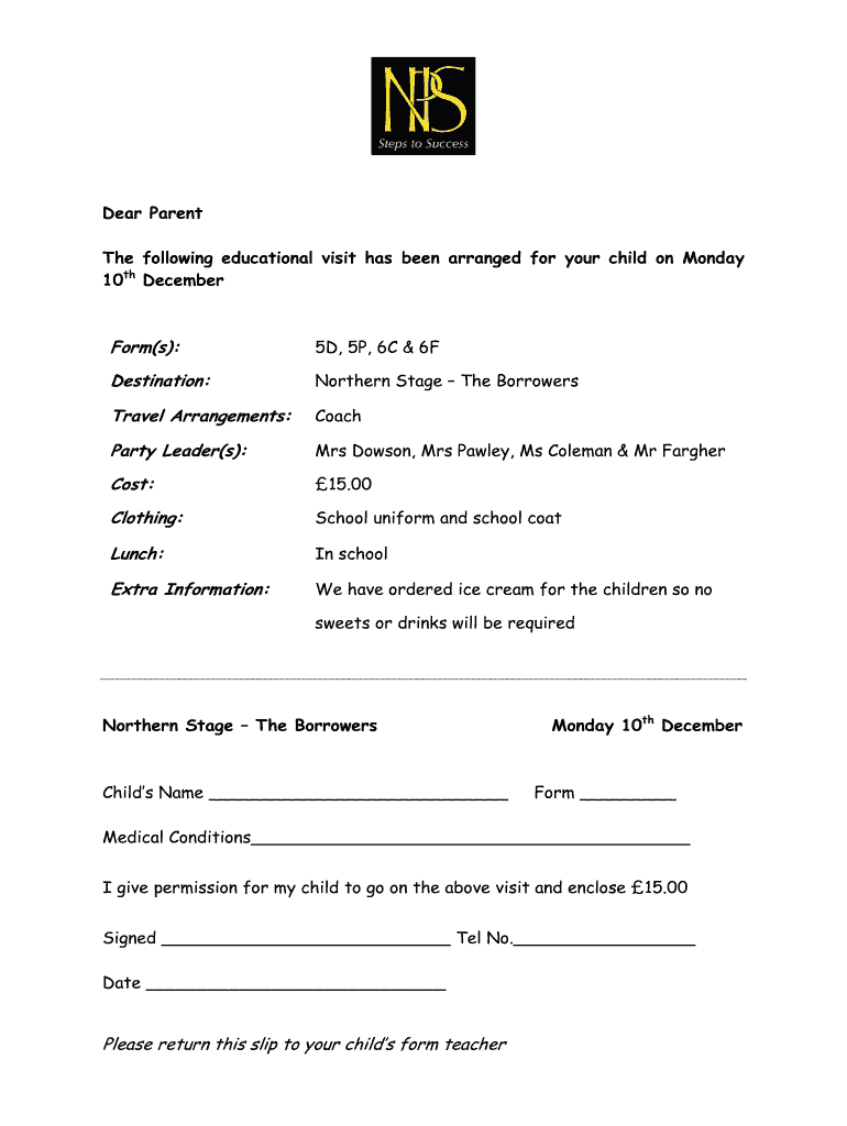 Dear Parent The following educational visit has been arranged for your child on Monday 10th December Form’s): 5D, 5P, 6C & 6F Destination: Northern Stages The Borrowers Travel Arrangements: Coach