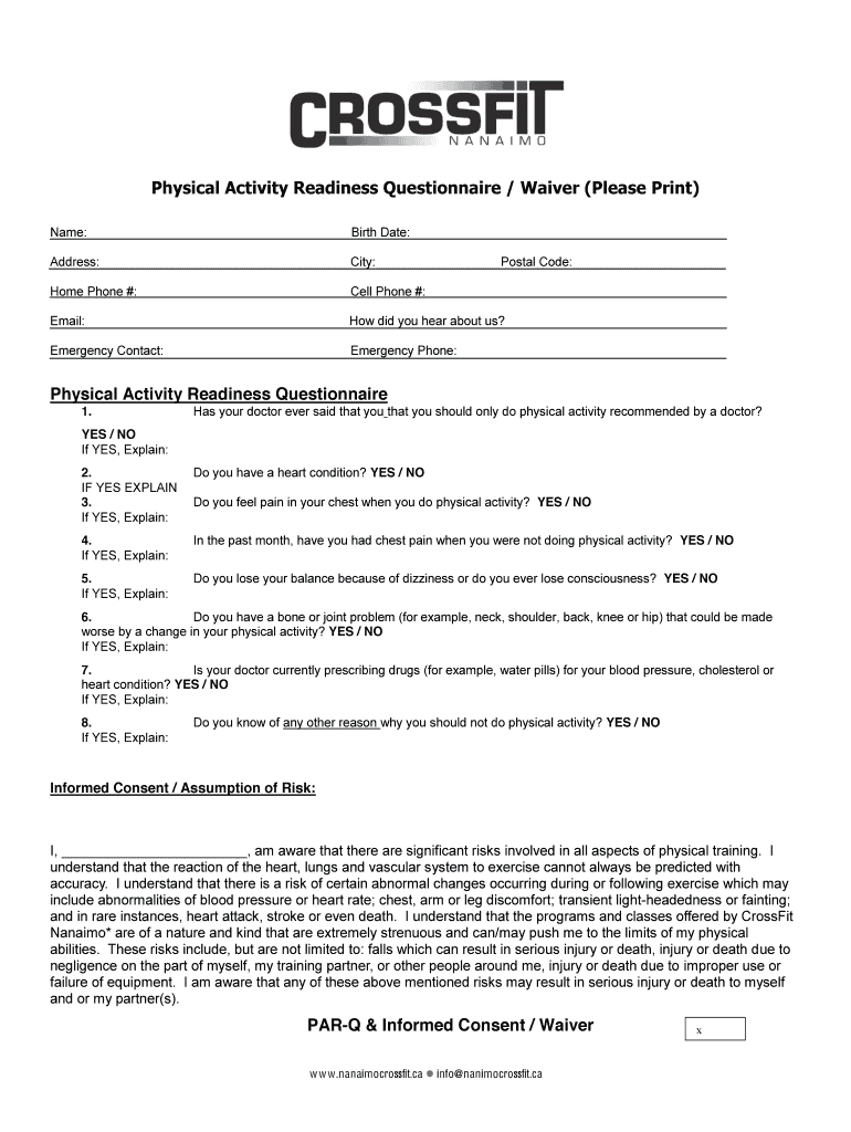 Get the free Physical Activity Readiness Questionnaire / Waiver (Please Print) Name: Birth Date: ...