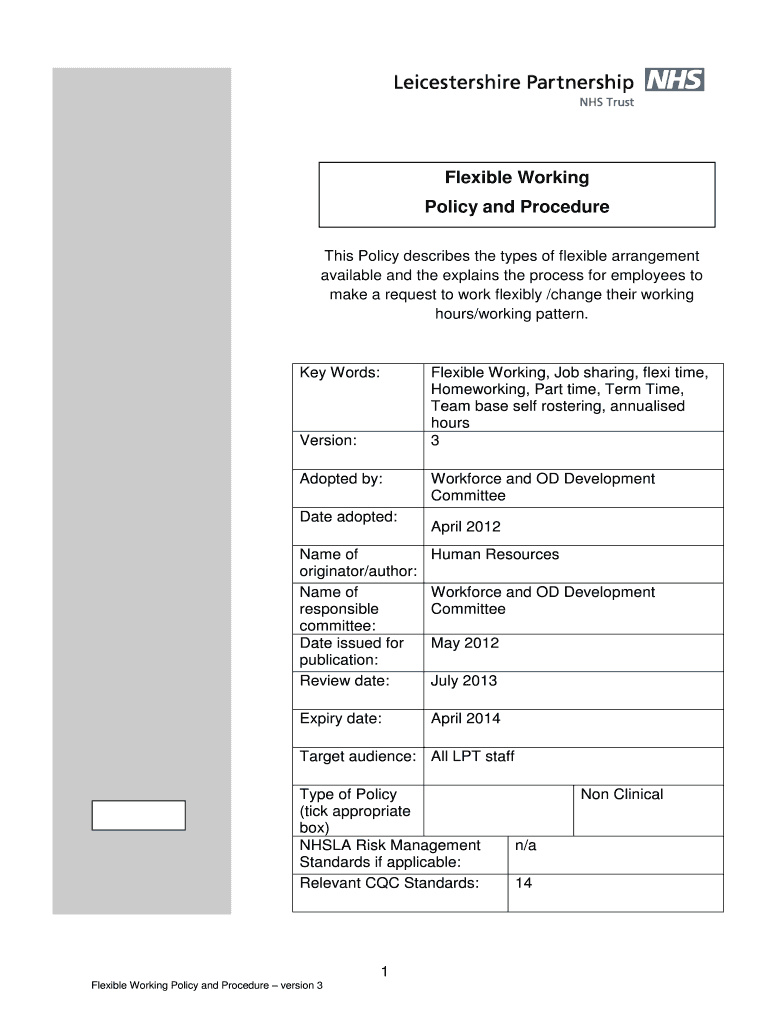 Flexible Working Policy and Procedure This Policy describes the types of flexible arrangement available and the explains the process for employees to make a request to work flexibly /change their
