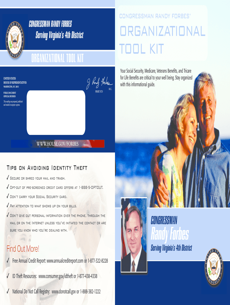 The Organizational Tool Kit serves as a comprehensive guide for document organization, specifically designed for residents in Virginia's 4th District. Created in partnership with Congressman Randy Forbes, this resource plays a vital role in helping individuals manage their personal documents efficiently. By offering a structured approach to document organization, the tool kit helps safeguard personal information against identity theft, ensuring that important documents remain secure and easily accessible.