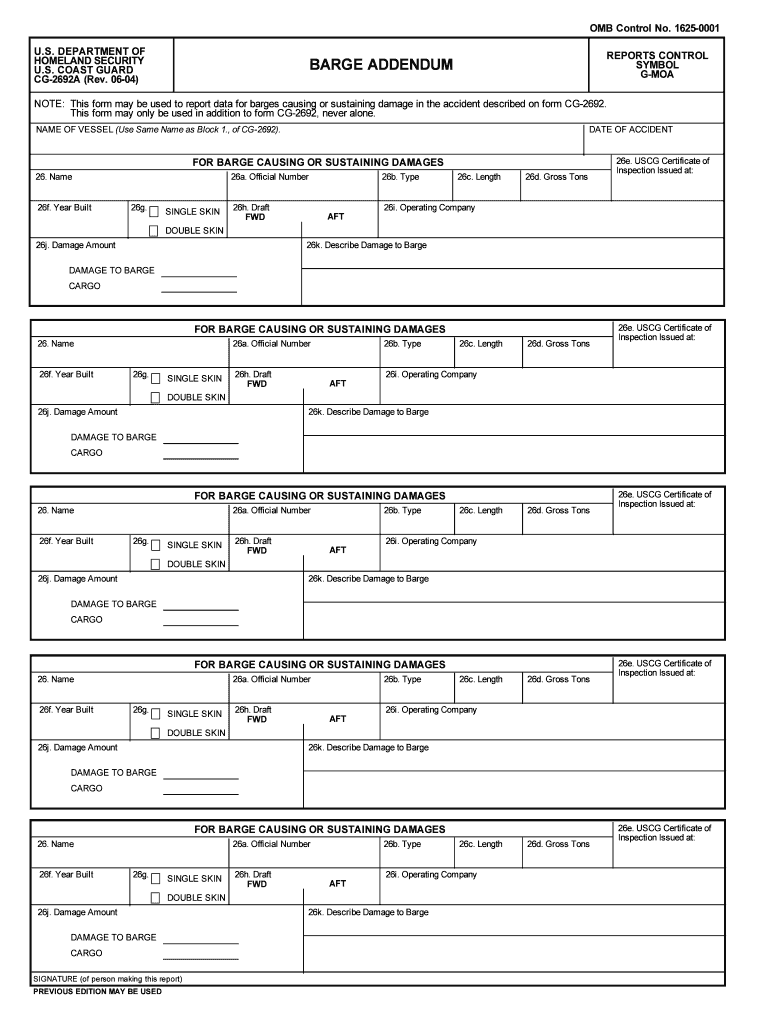 The USCG Barge Addendum Report Form, officially known as the CG-2692A form, is essential for documenting incidents involving barges that contribute to or sustain damage in maritime accidents. This form complements the CG-2692 and serves a critical function in the reporting process. It becomes necessary when a barge accident occurs, ensuring that relevant data is accurately recorded and submitted to the authorities.