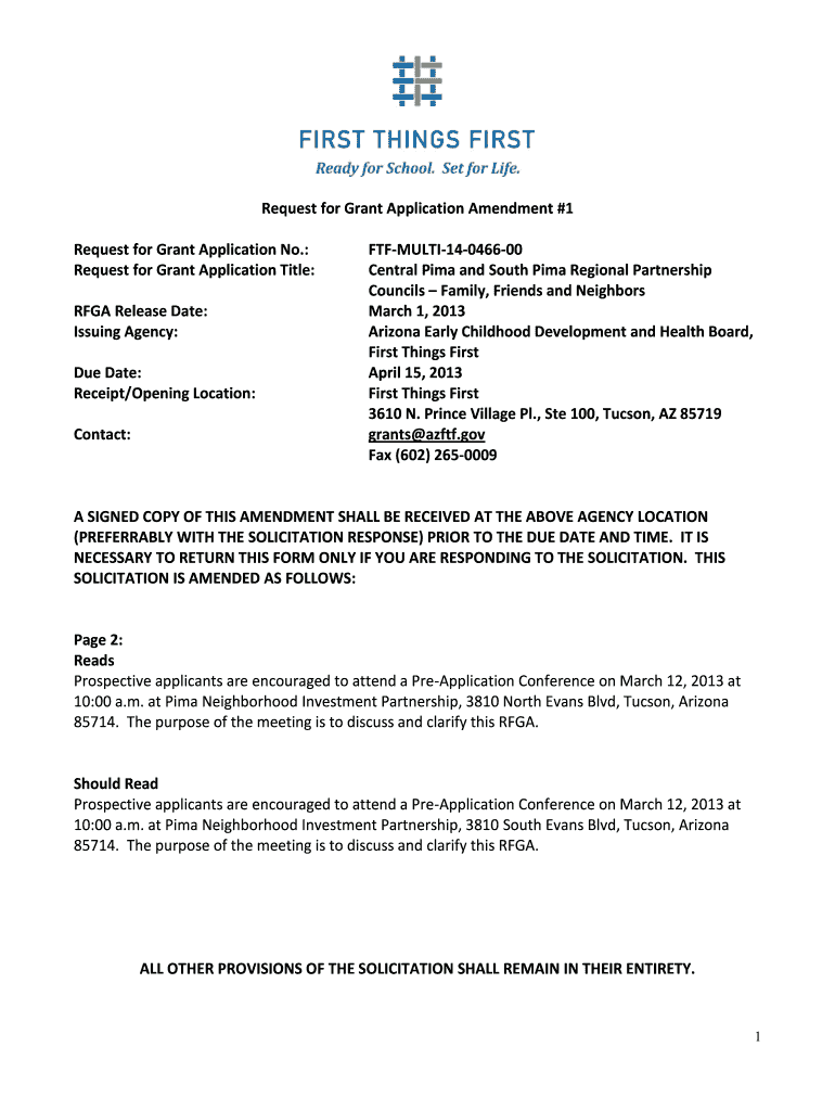This document serves as an amendment to the Request for Grant Application, detailing changes to the Pre-Application Conference location and other information pertaining to the application process.