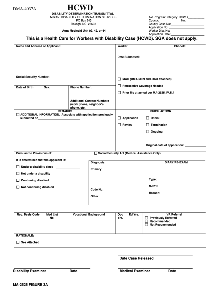 HWD DMA-4037A DISABILITY DETERMINATION TRANSMITTAL Mail to: DISABILITY DETERMINATION SERVICES PO Box 243 Raleigh, NC 27602 Aid Program×Category: HWD County: No: County Case No: Application No: Worker