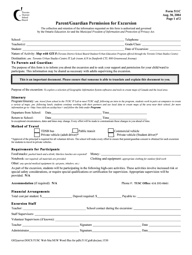 Form 511C Aug. 30, 2004-Page 1 of 2 Parent×Guardian Permission for Excursion The collection and retention of the information requested on this form is authorized and governed by the Ontario Education