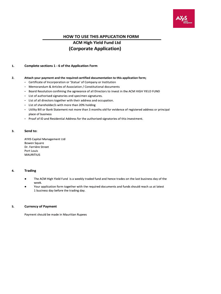 HOW TO USE THIS APPLICATION FORM ACM High Yield Fund Ltd (Corporate Application) 1. Complete sections 1 6 of the Application Form 2. Attach your payment and the required certified documentation to