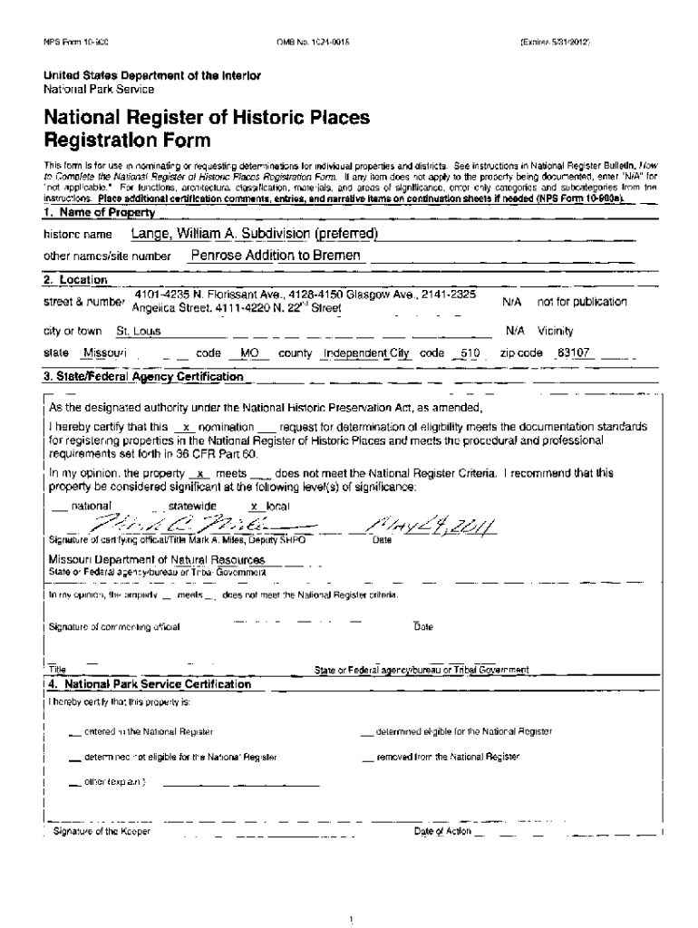 This document serves to nominate or request determinations for individual properties and districts for the National Register of Historic Places, providing detailed information about the Lange, William