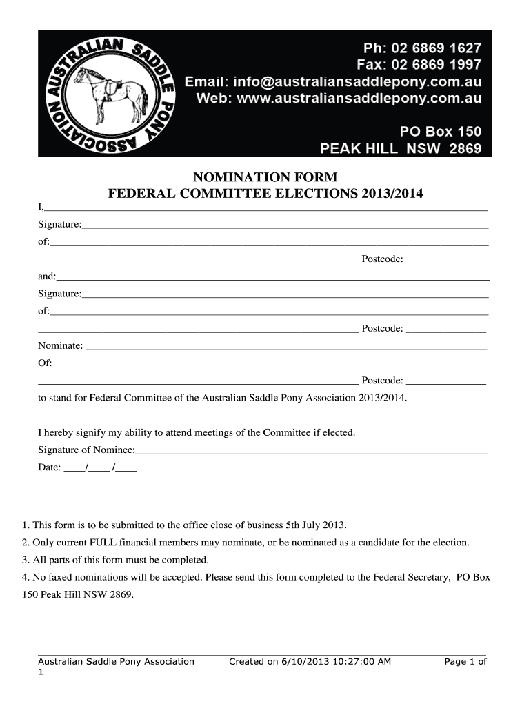 NOMINATION FORM FEDERAL COMMITTEE ELECTIONS 2013×2014 I, Signature: of: Postcode: and: Signature: of: Postcode: Nominate: Of: Postcode: to stand for Federal Committee of the Australian Saddle Pony