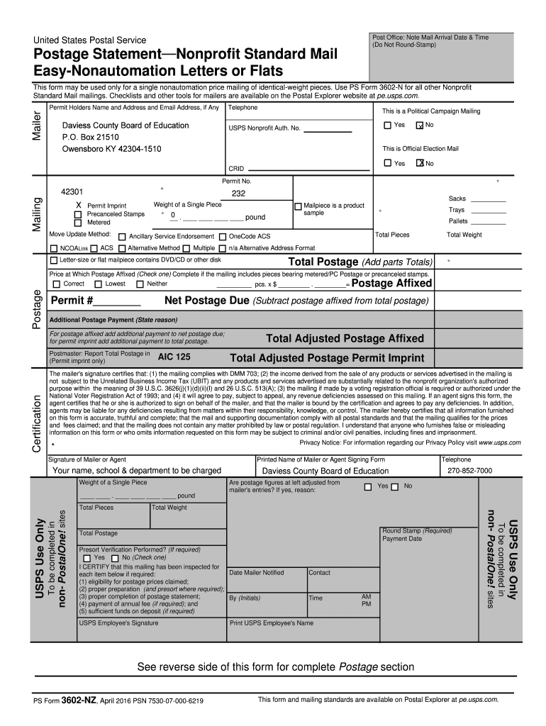 PS Form 3602-NZ, April 2016 PSN 7530-07-000-6219. This form and mailing standards are available on Postal Explorer at PE.usps.com. Mailer. Mailing.