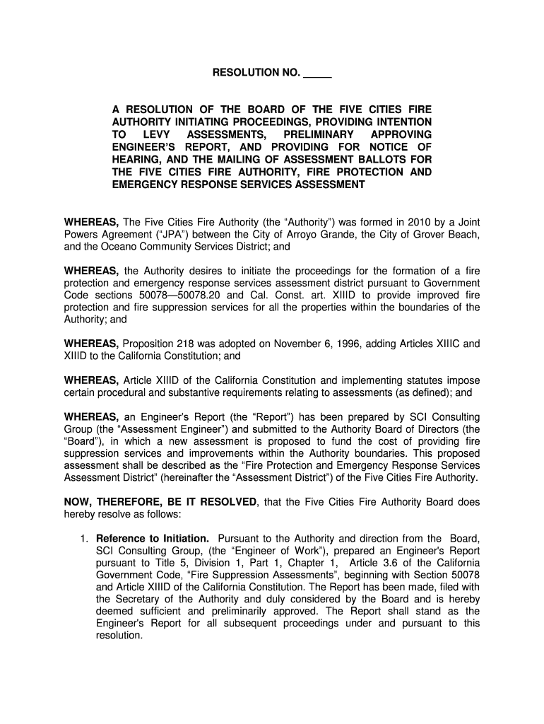RESOLUTION NO. A RESOLUTION OF THE BOARD OF THE FIVE CITIES FIRE AUTHORITY INITIATING PROCEEDINGS, PROVIDING INTENTION TO LEVY ASSESSMENTS, PRELIMINARY APPROVING ENGINEERS REPORT, AND PROVIDING FOR
