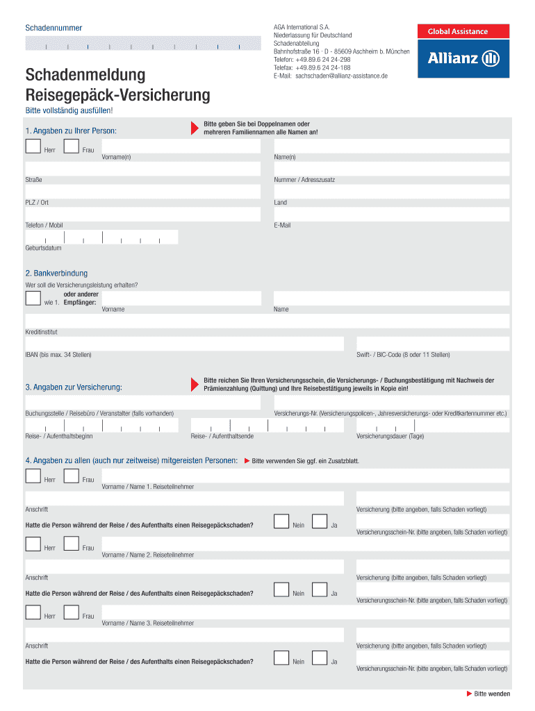 Schadenformular Reisegepäck-Versicherung is a form used to report damages or losses to luggage during travel.