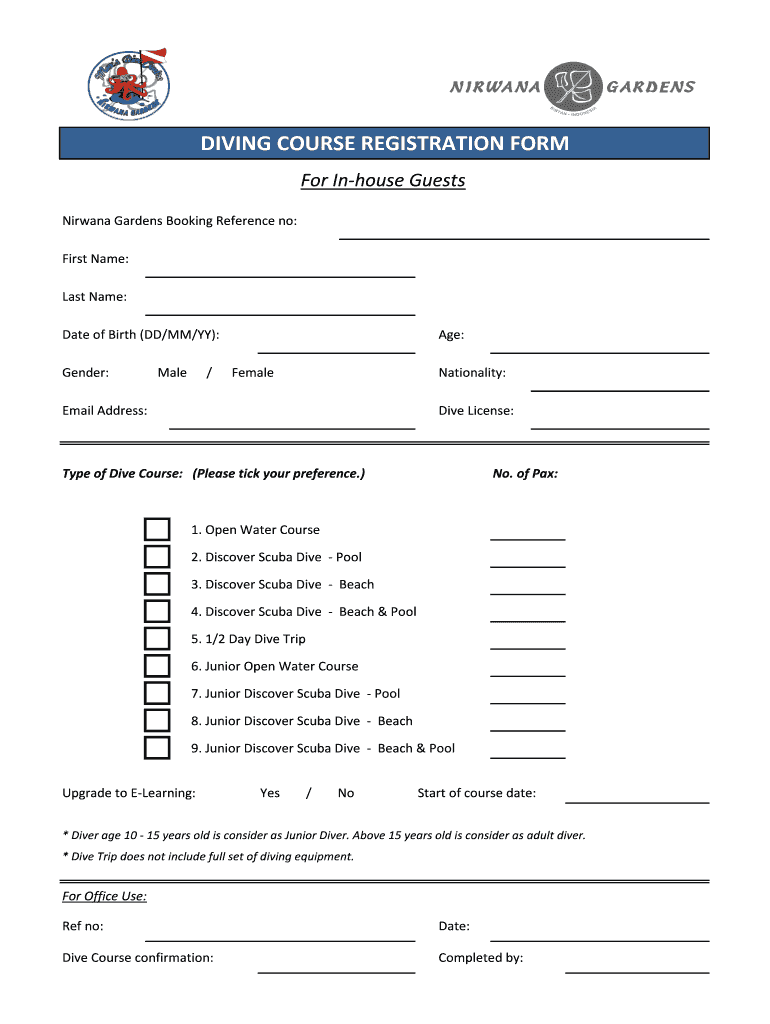 DIVING COURSE REGISTRATION FORM For In house Guests Nirvana Gardens Booking Reference no: First Name: Last Name: Date of Birth (DD×MM/BY): Gender: Male / Age: Female Nationality: Email Address: Dive