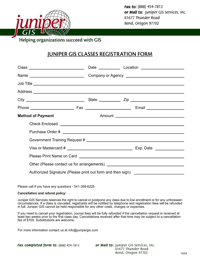 Fax to: (888× 4547813 or Mail to: Juniper GIS Services, Inc. 61677 Thunder Road Bend, Oregon 97702 Helping organizations succeed with GIS JUNIPER GIS CLASSES REGISTRATION FORM Class Date Location