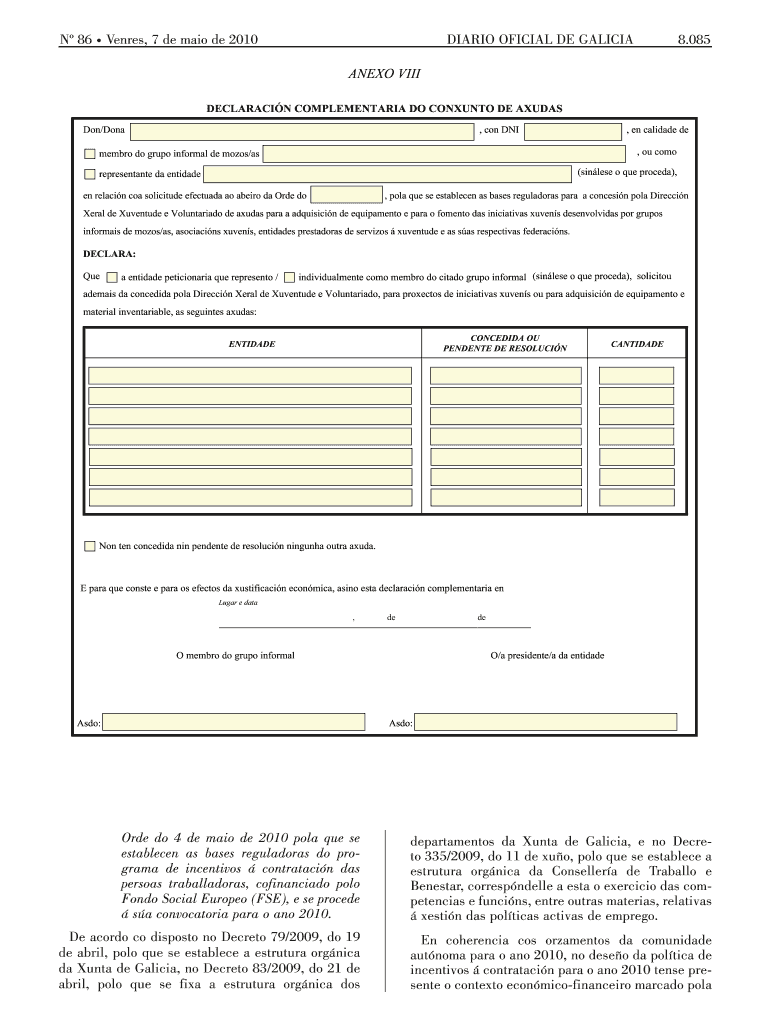 N 86 Venues, 7 DE main DE 2010 DARIO OFFICIAL DE GALICIA 8.085 NEXT VIII DECLARATION COMPLEMENT ARIA DO COUNTY DE JUDAS Don×Dona, con DNI, en validate DE, of Como member do group informal DE bozos×as